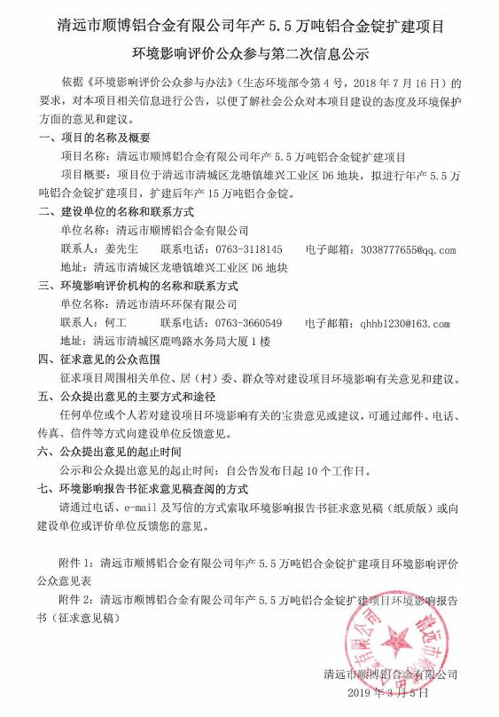清遠(yuǎn)市順博鋁合金有限公司年產(chǎn)5.5萬噸鋁合金錠擴(kuò)建項(xiàng)目 環(huán)境影響評(píng)價(jià)公眾參與第二次信息公示